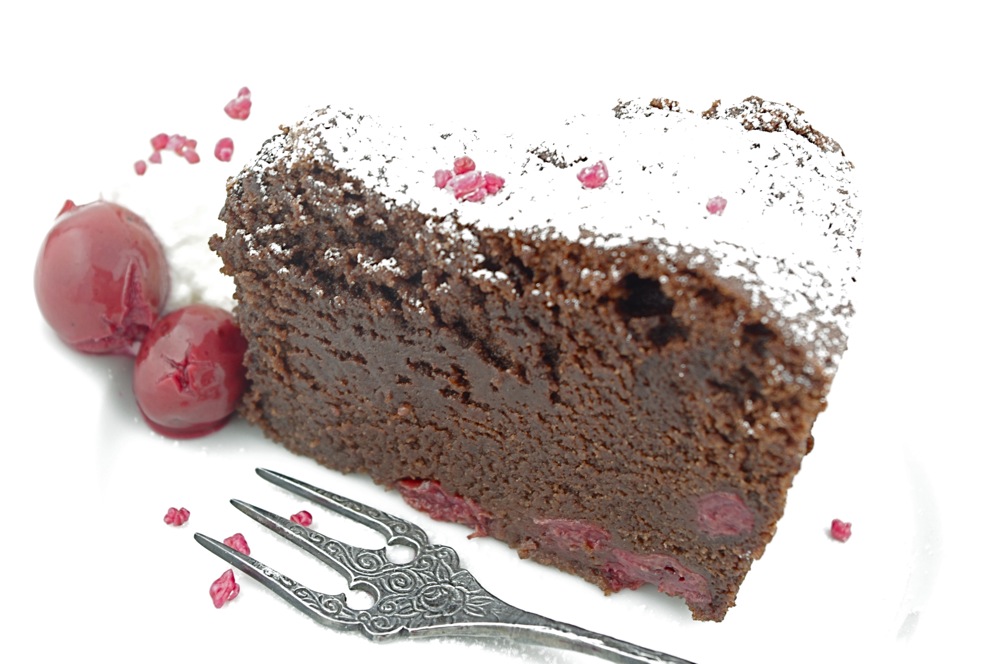 And for him I offer my heart, my love on a plate: rich, decadent Chocolate Pound Cake, more like a mousse than a cake, cool, very dense, more than moist, infused with cherry, dotted with fruit, whispering of espresso. I carefully place one thin wedge on a plate, besprinkle the dark cake with a dusting of powdered sugar, slather it with Mascarpone Whipped Cream, barely sweetened and delicately flavored with vanilla, add a few cherries, maybe a shower of candied rose petals and I offer him such bliss, spoil him with such opulence, pamper him with such sensual pleasure that, as he cleans his plate, savors the final crumbs, places his fork delicately on the plate, he looks at me with eyes afire and whispers…”Happy Valentine’s Day, my love.”