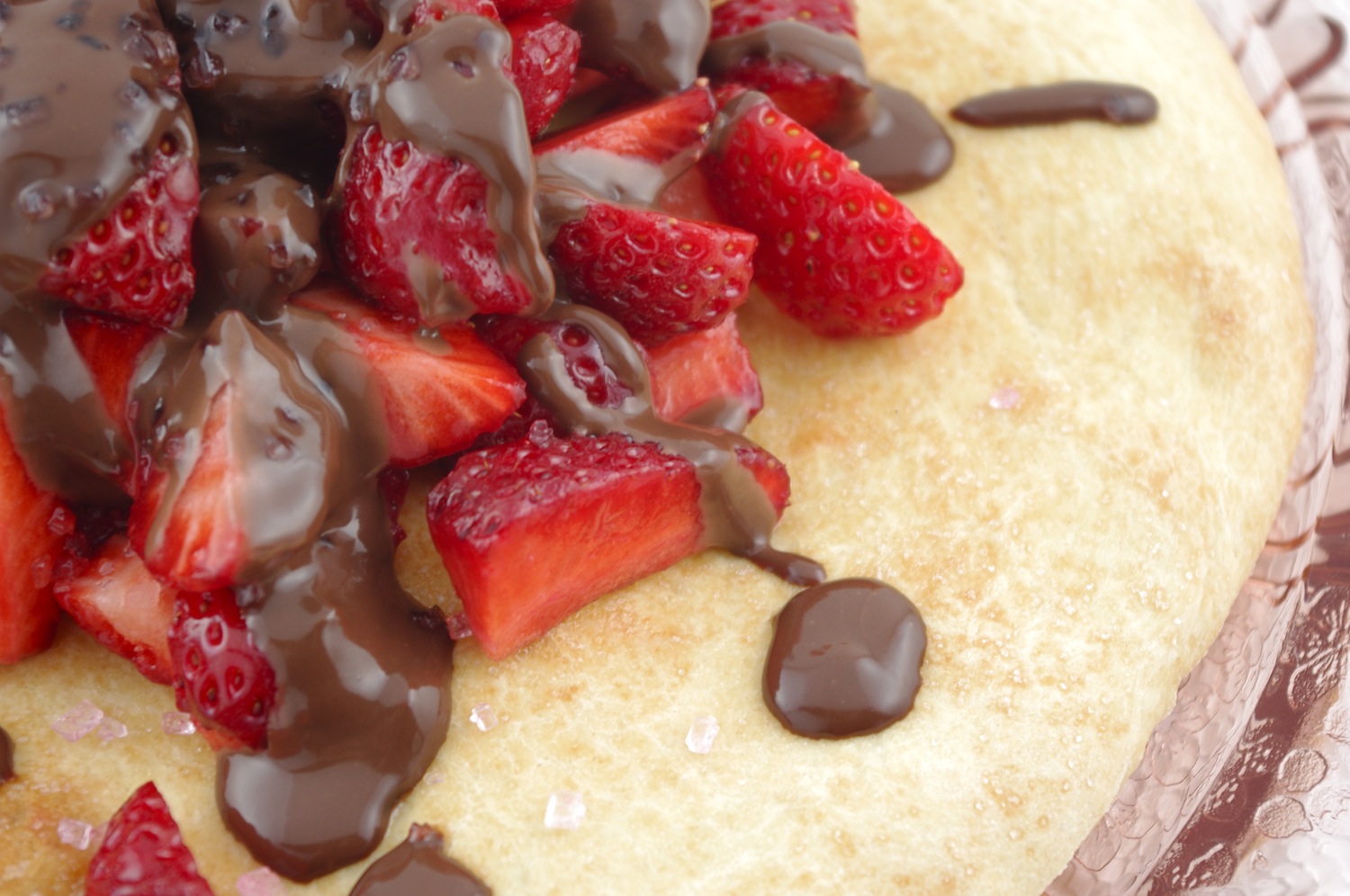 Remove from the oven or skillet to a plate, pile with hulled, sliced strawberries and drizzle with as much chocolate ganache as you please. Sprinkle with colored sugar crystals or powdered sugar if you like. You can also serve this with a scoop or two of ice cream or topped with freshly whipped cream.